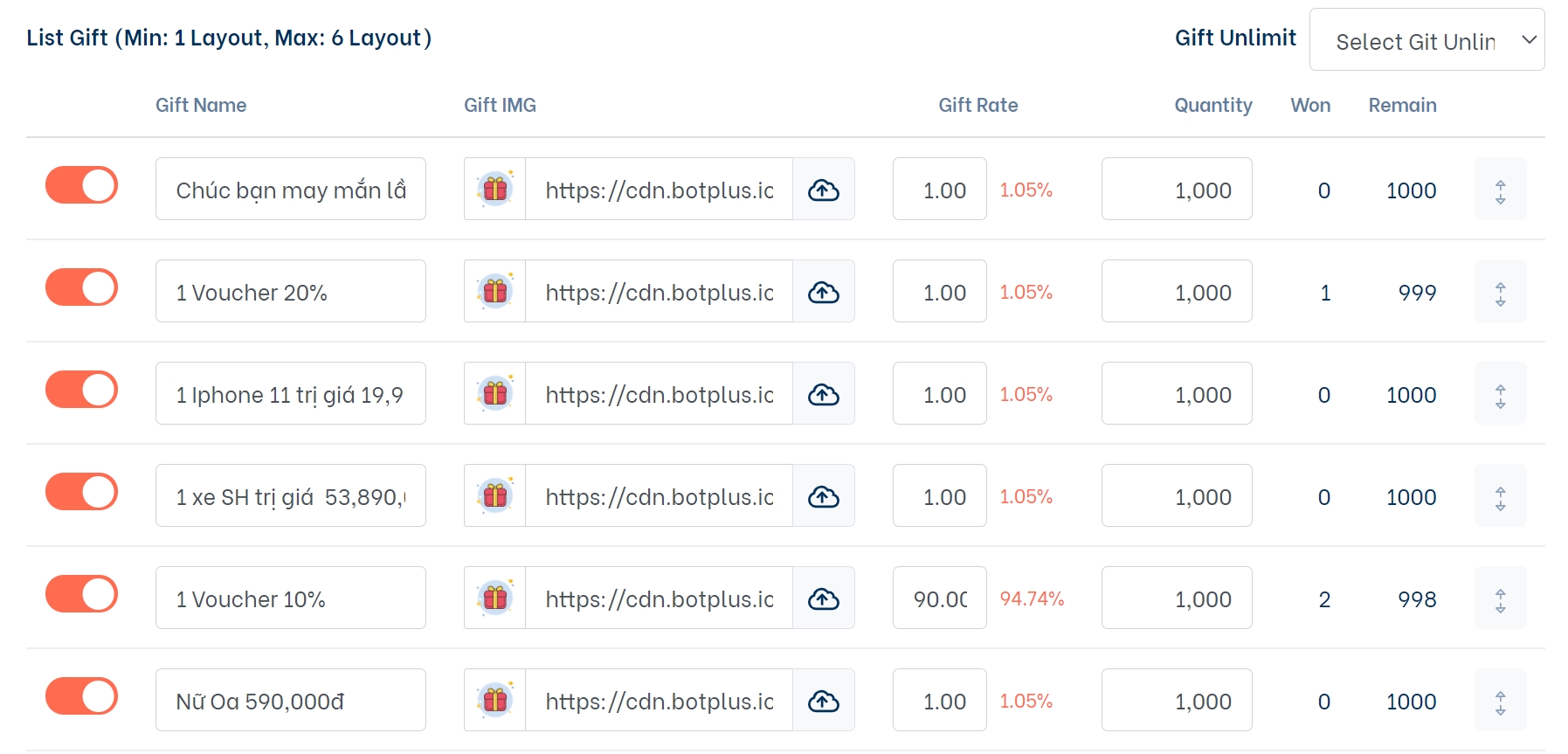 List Gift (The maximum number of prizes, depends on the number of prizes you selected above)