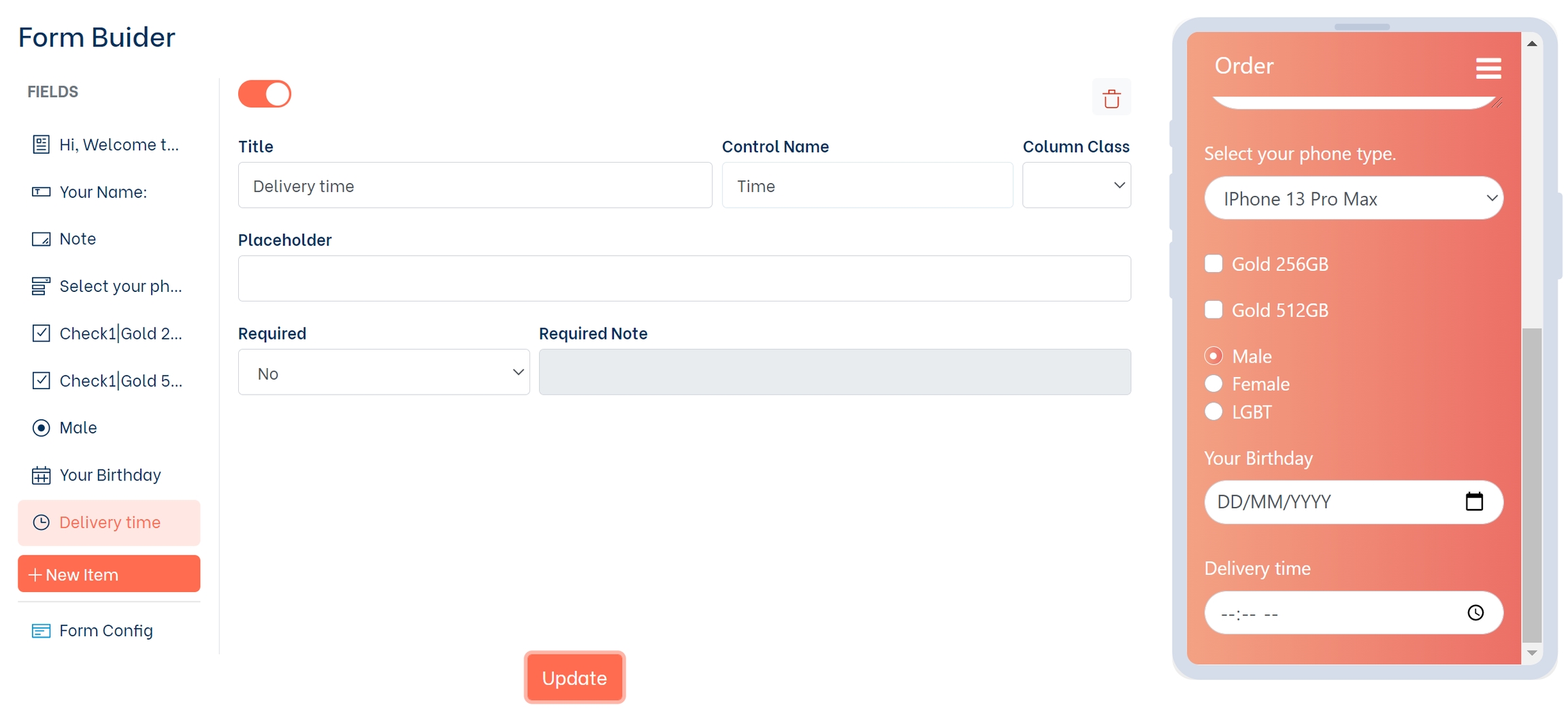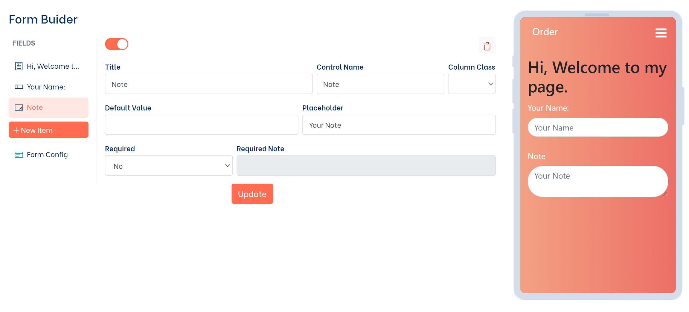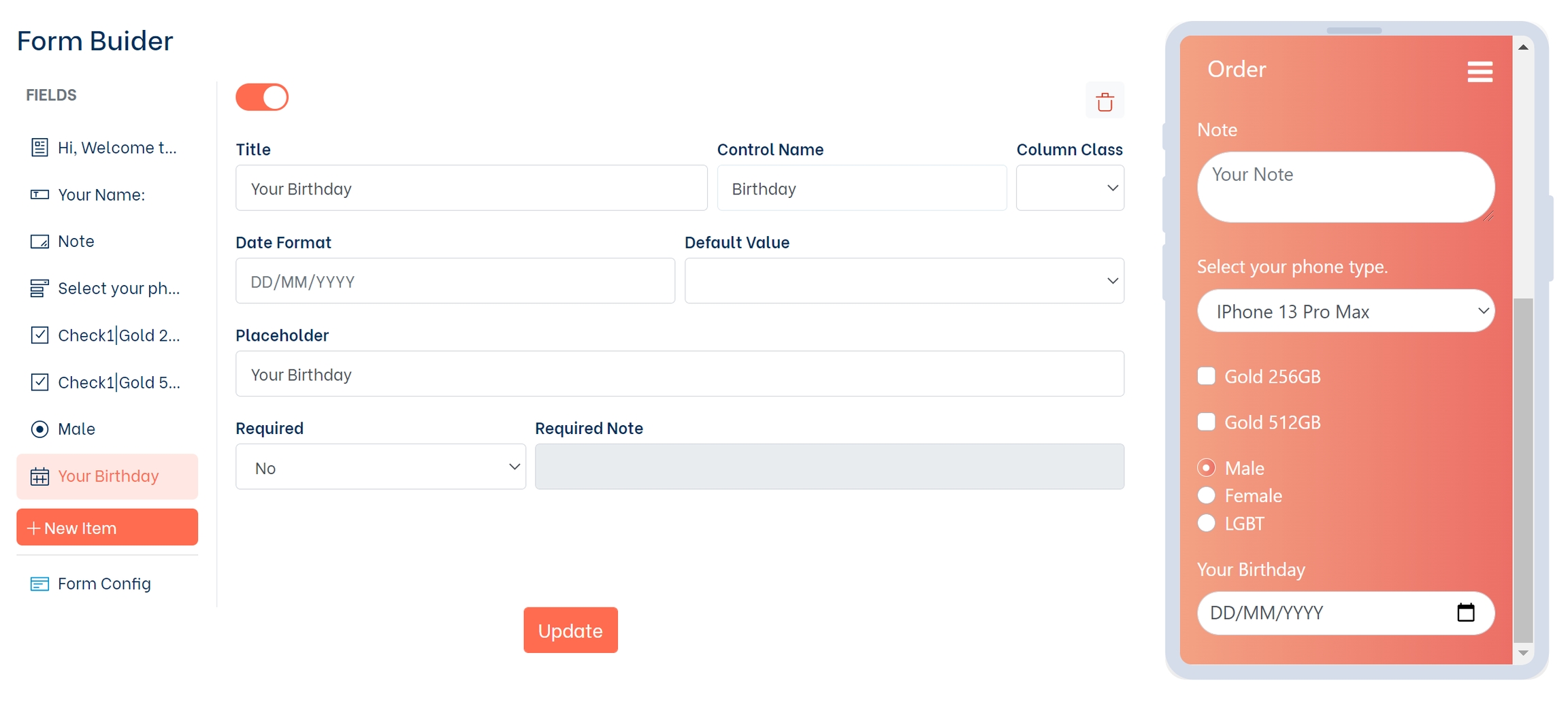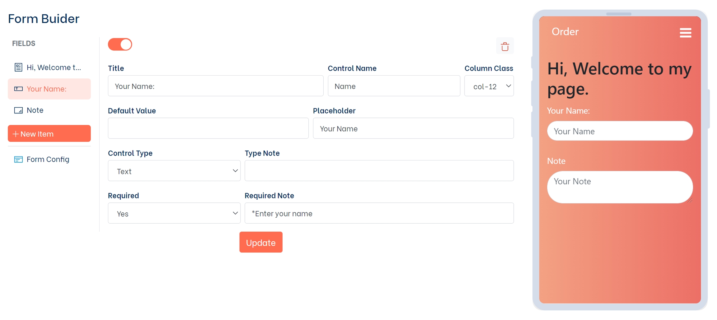 Control Type: Field input type (Text, Number, Email, Url, Password, Hidden...)