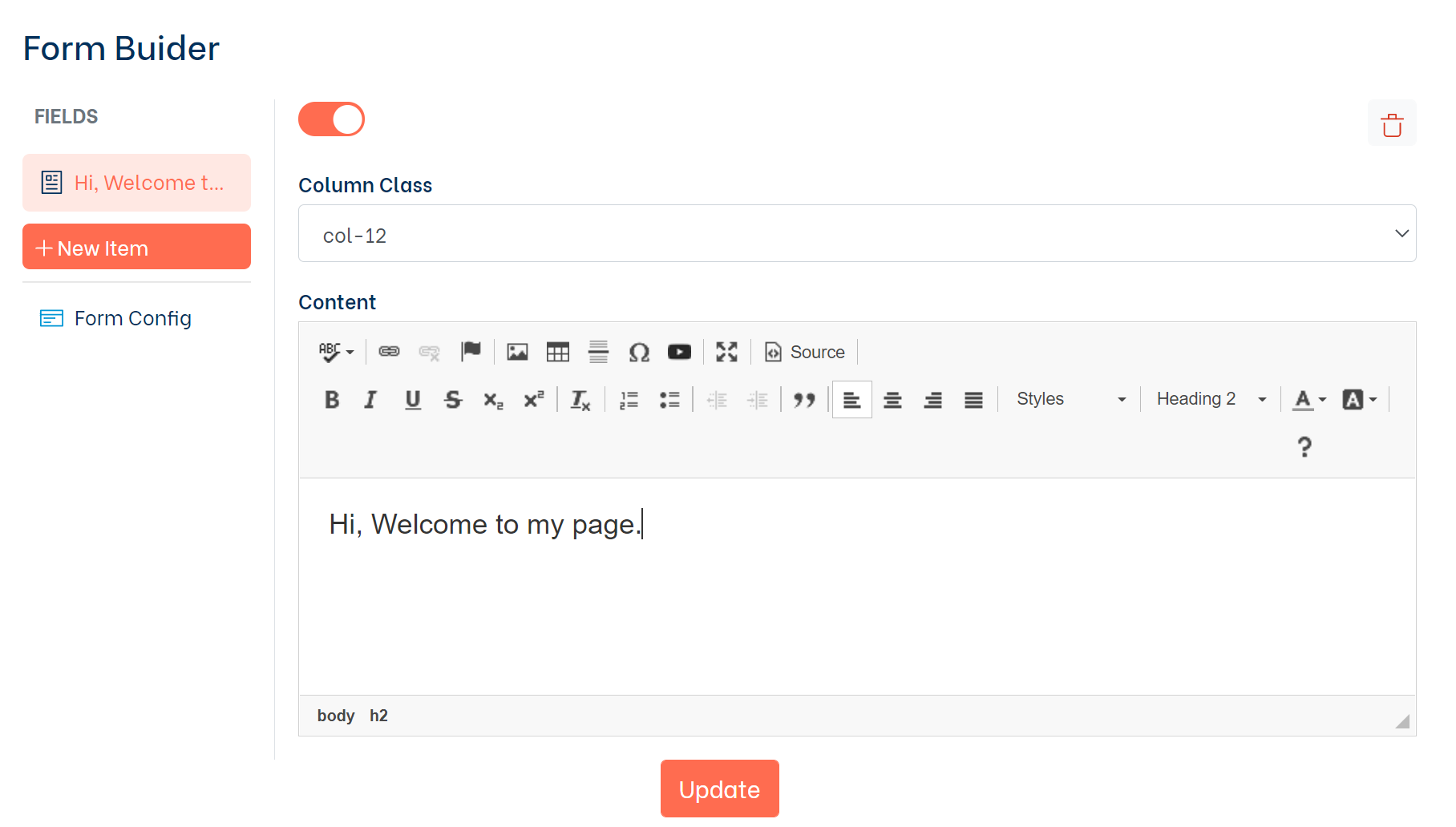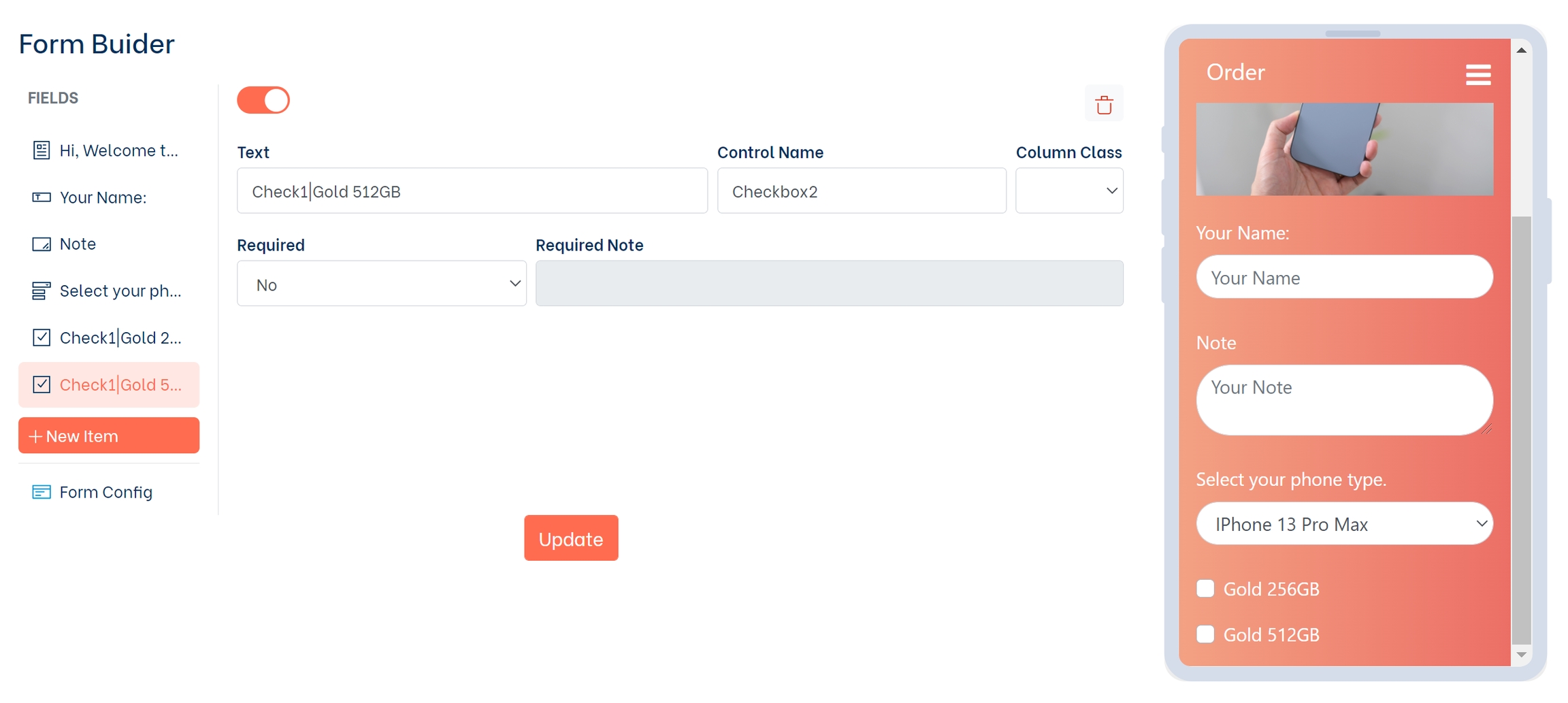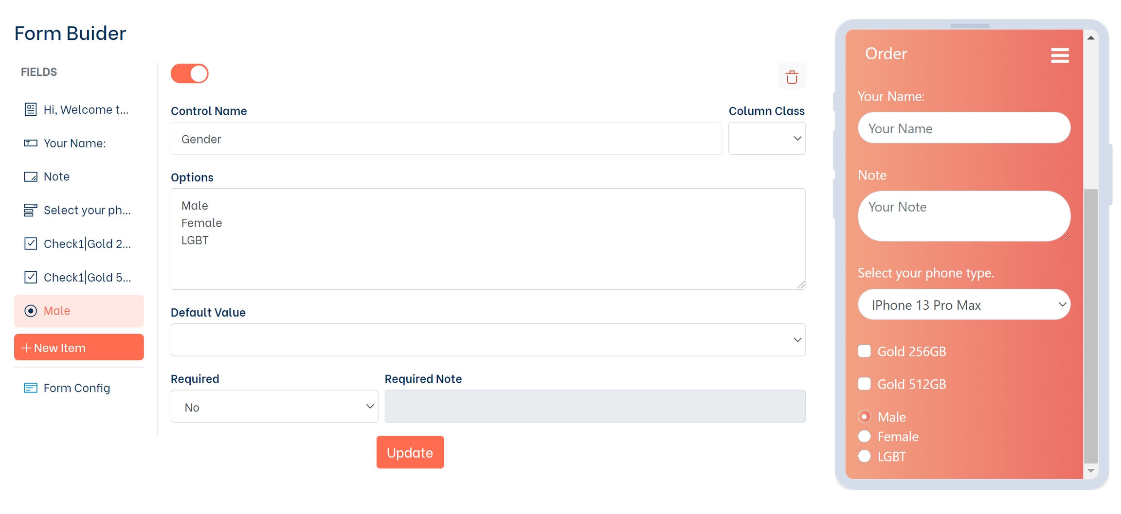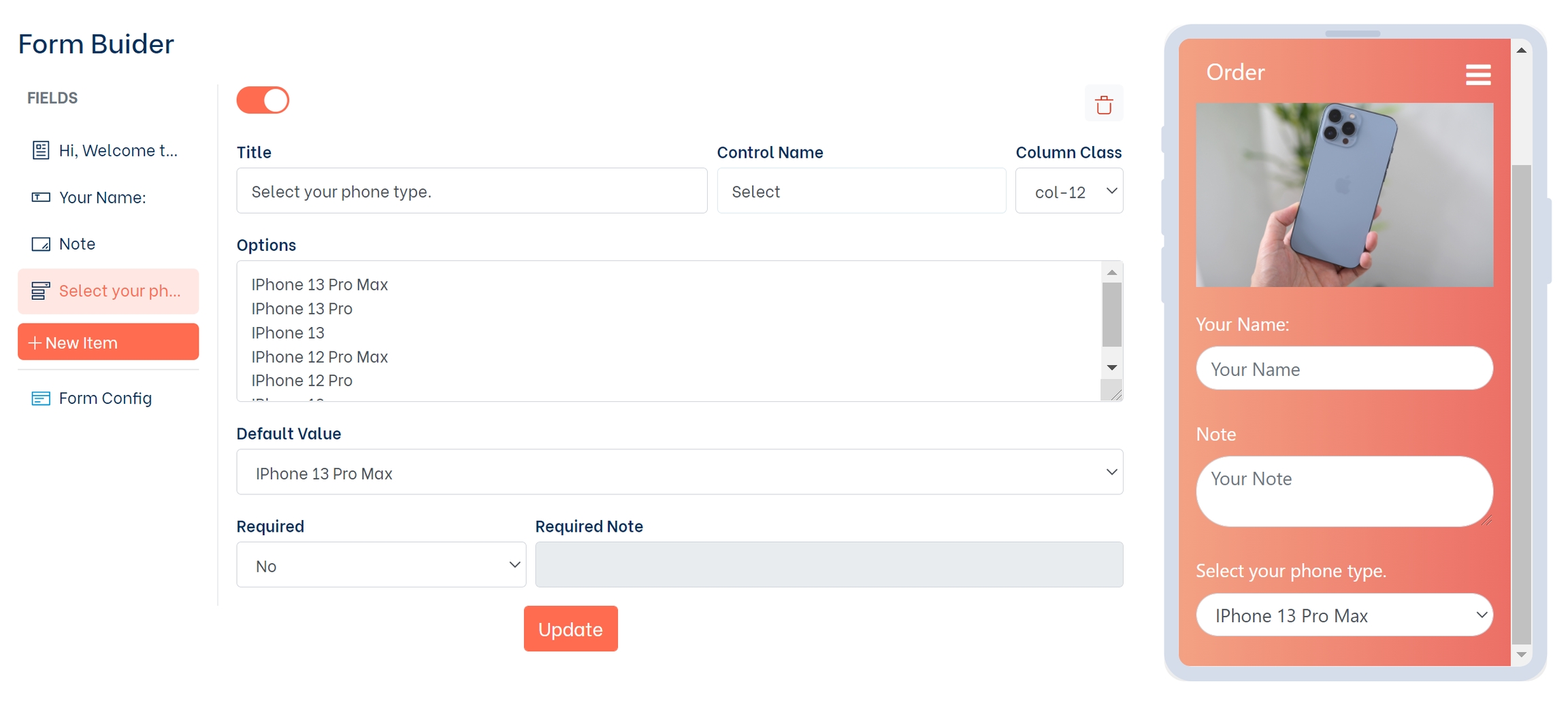 Control Type: Field input type (Text, Number, Email, Url, Password, Hidden...)