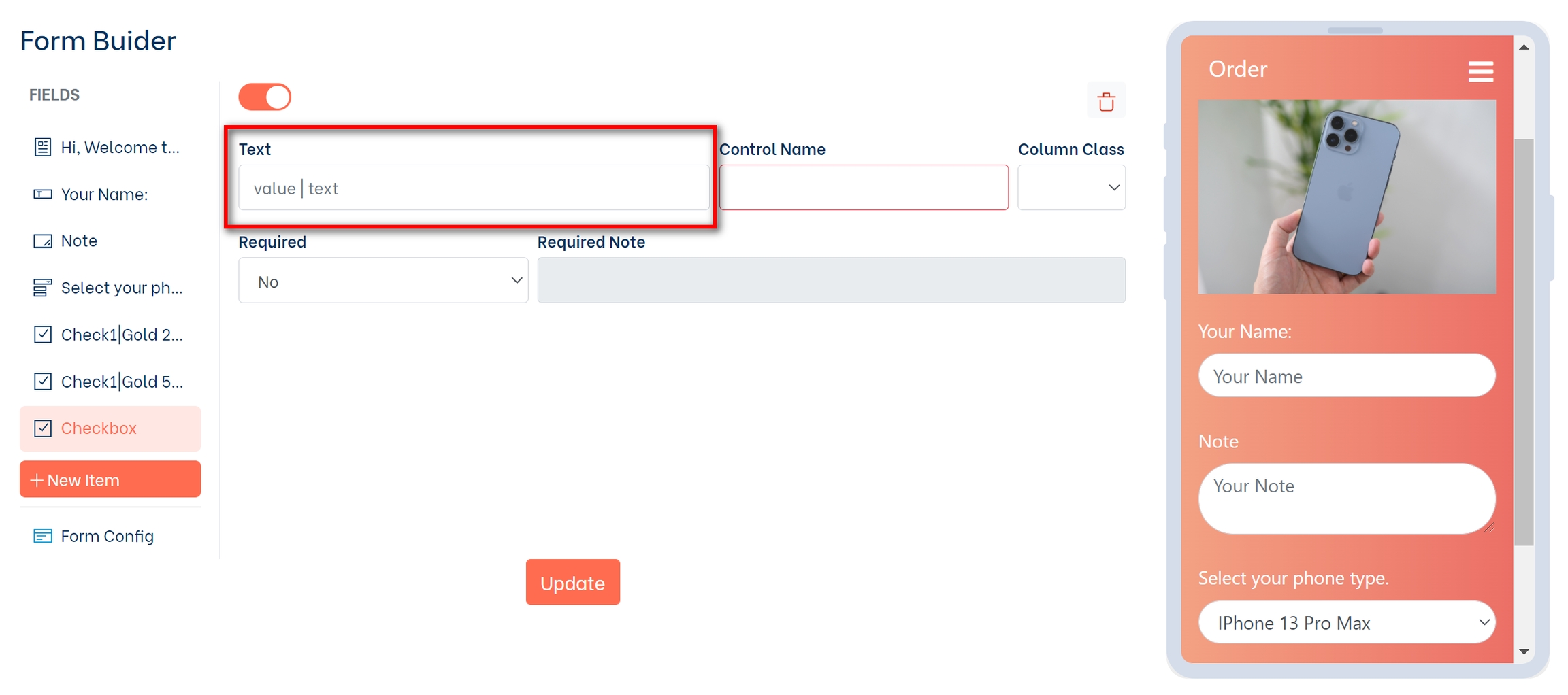Value: If you enter here Value| Name, the Name will be used to display on the webview, and the Value will be used to set the value for the Control Name
