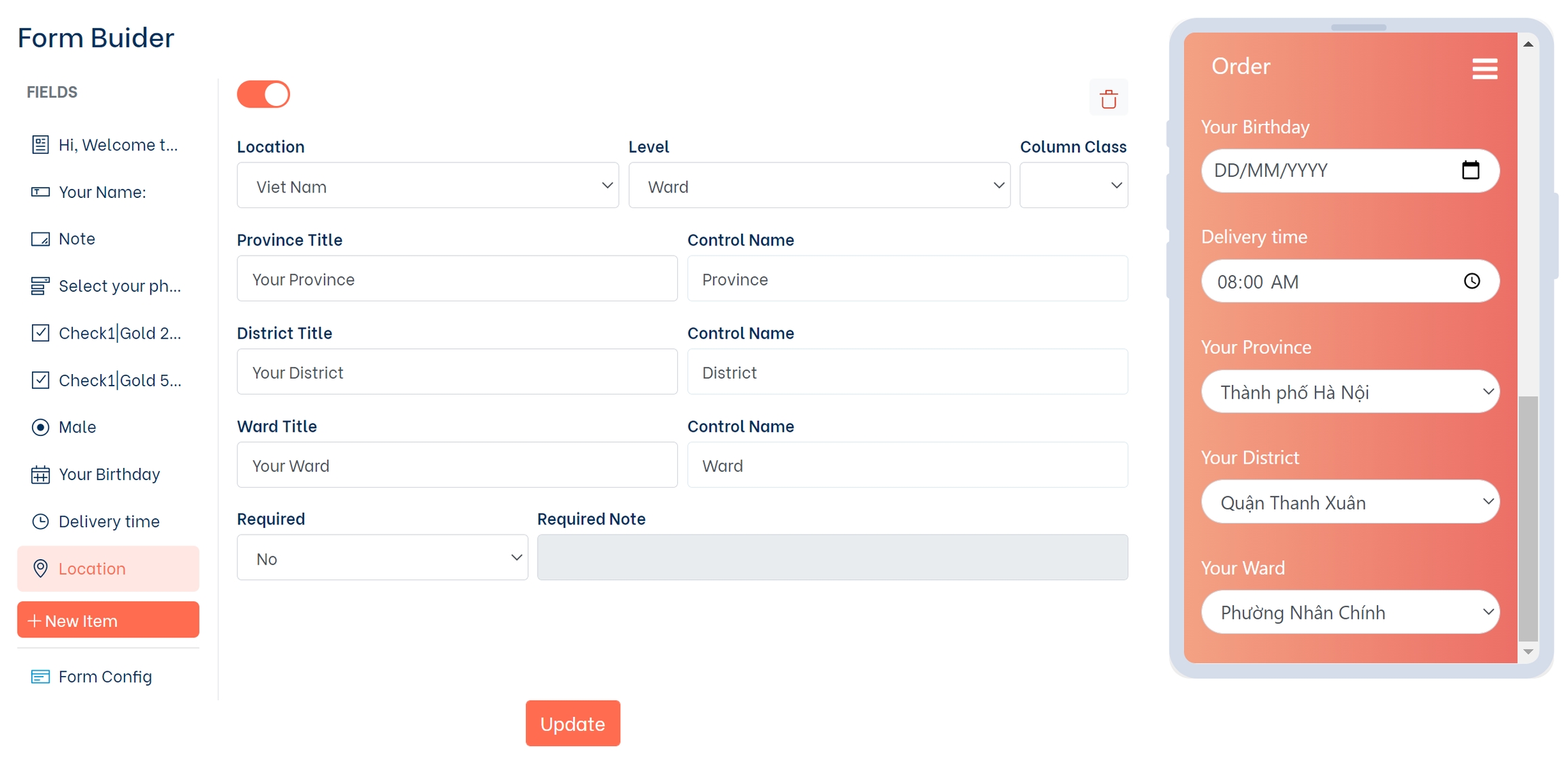 The Location card helps you create an administrative boundary field for customers to choose from to help get the customer's address information. Currently, the card only supports borders in Vietnam.