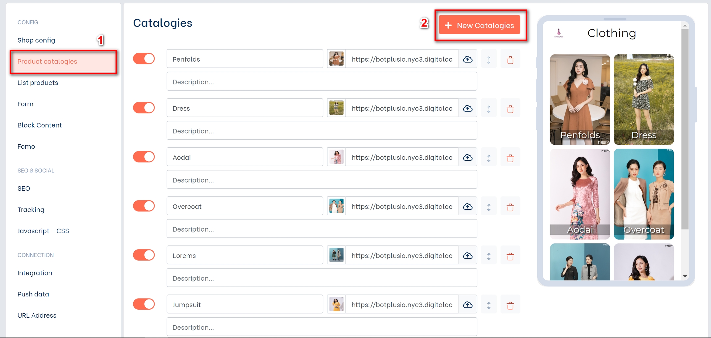 To add a new category , click on Product categories (1) then Create New Categories (2)