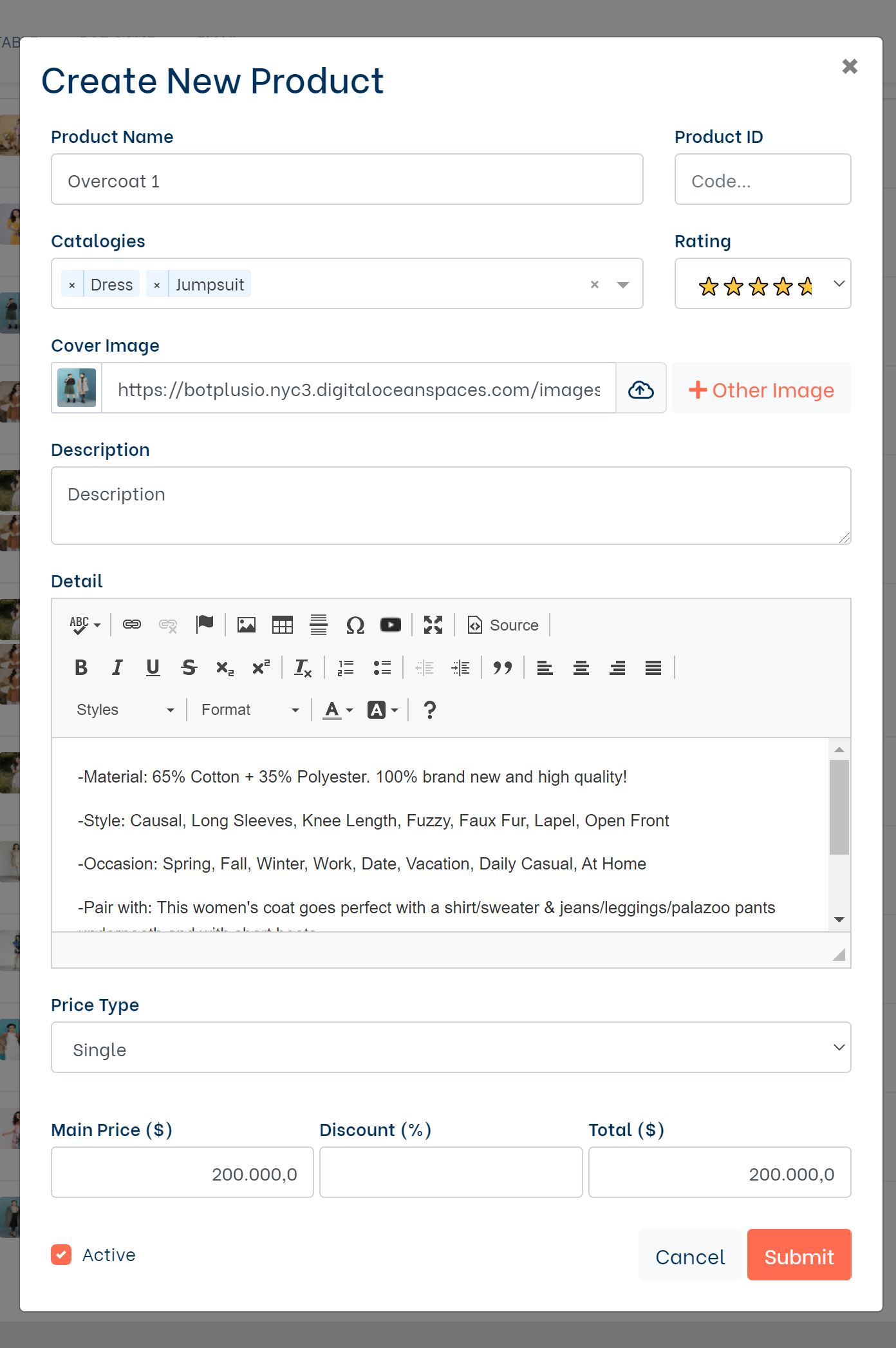 The Create new product pop-up:
