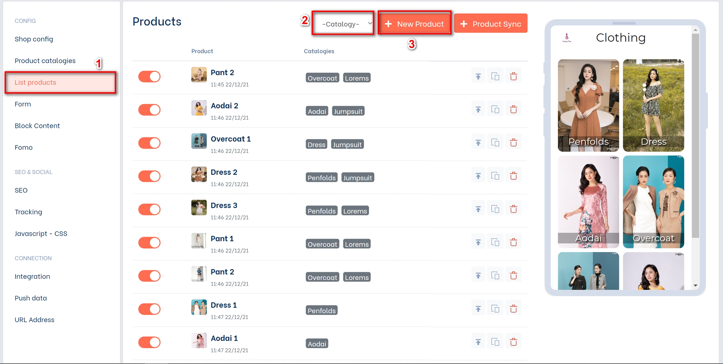 To add a product, please click List Products (1) then Create new Product (3). You can add more categories to your products here: